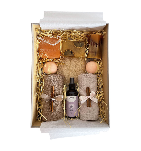 2 Vanilla Bath Bombs 2 Face Towels 1 Loofah Soap 1 Orange Soap 1 Cinnamon Candle 1 Loofah Sponge 1 Sweet Grape Body Mist