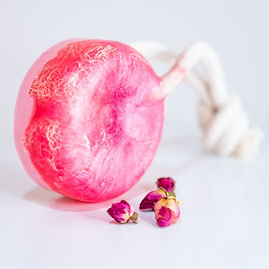 Exfoliating is one of the best things you can do for your skin. It helps rid your skin of dead cells. The most common exfoliant to use is this natural loofah sponge combine with glycerin and goat milk soap. Scented with rose essential oil.
