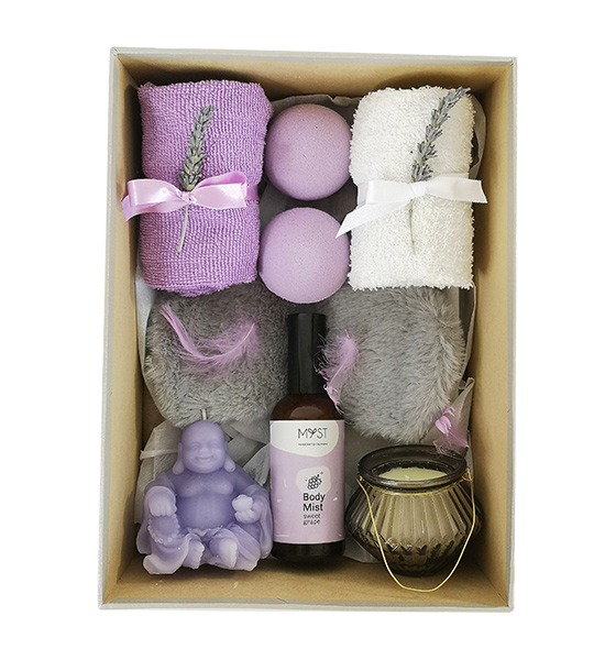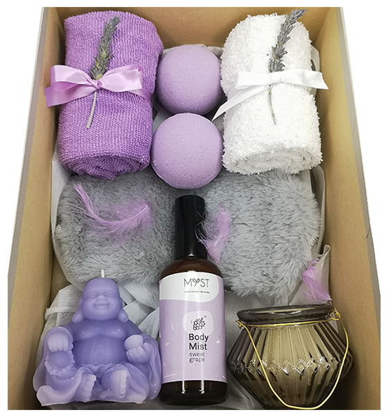 2 Lavender Bath Bombs (100g each) 2 Face Towels 1 Sleep Mask 1 Buddha Candle 1 Sweet Grape Body Mist 1 Lavender Candle